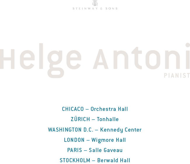Helge Antoni, exclusive Steinway Artist, has been praised by Gramophone Magazine for his »ravishingly beautiful« playing, »beautiful singing tone,« and »most poetic phrasing.« He is a highly sought-after concert pianist, especially for his